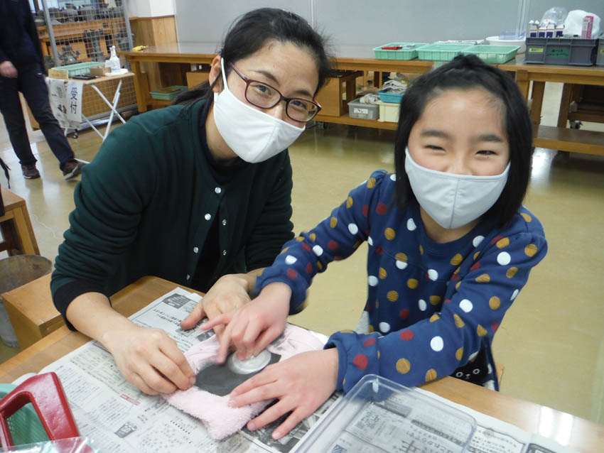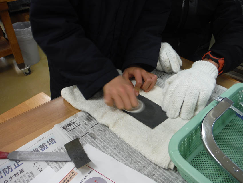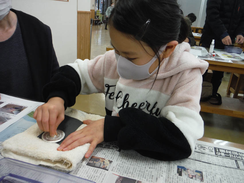 鏡の研磨作業では熱心に磨いてピカピカに仕上げる方が多く、「古代の人は何を使って磨いていたのですか?」「鏡はどのように使われていたのですか?」などの質問をしながら磨かれていました。最後には「疲れたけど楽しかった!」「とてもお気に入りの鏡ができた!」と、笑顔で体験を終えられていました。